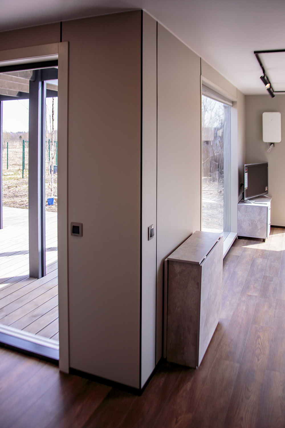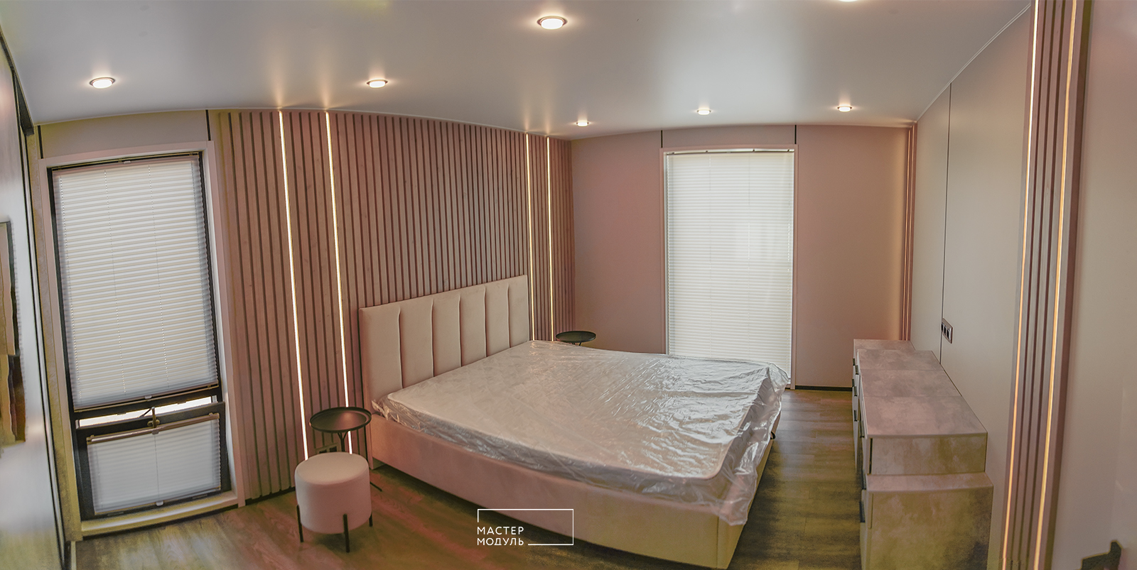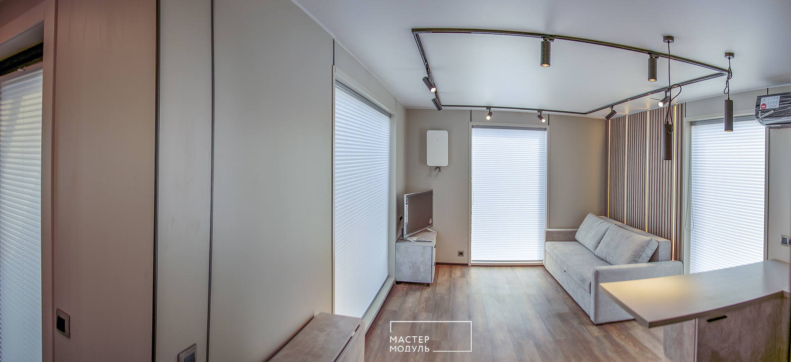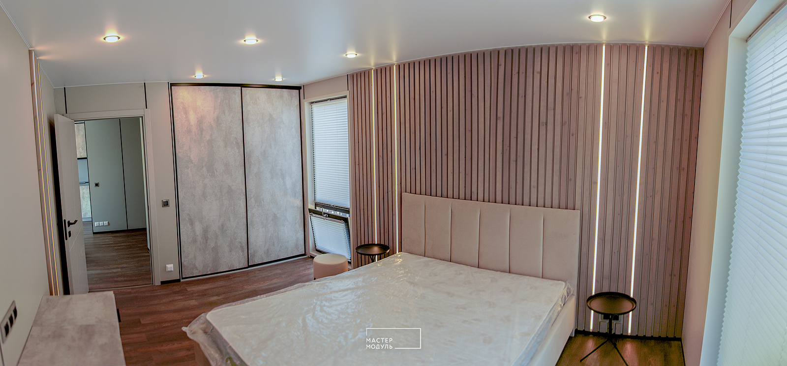- стены - стекломагниевые листы 8 мм, окрашенные акриловой краской, деревянная реечная панель