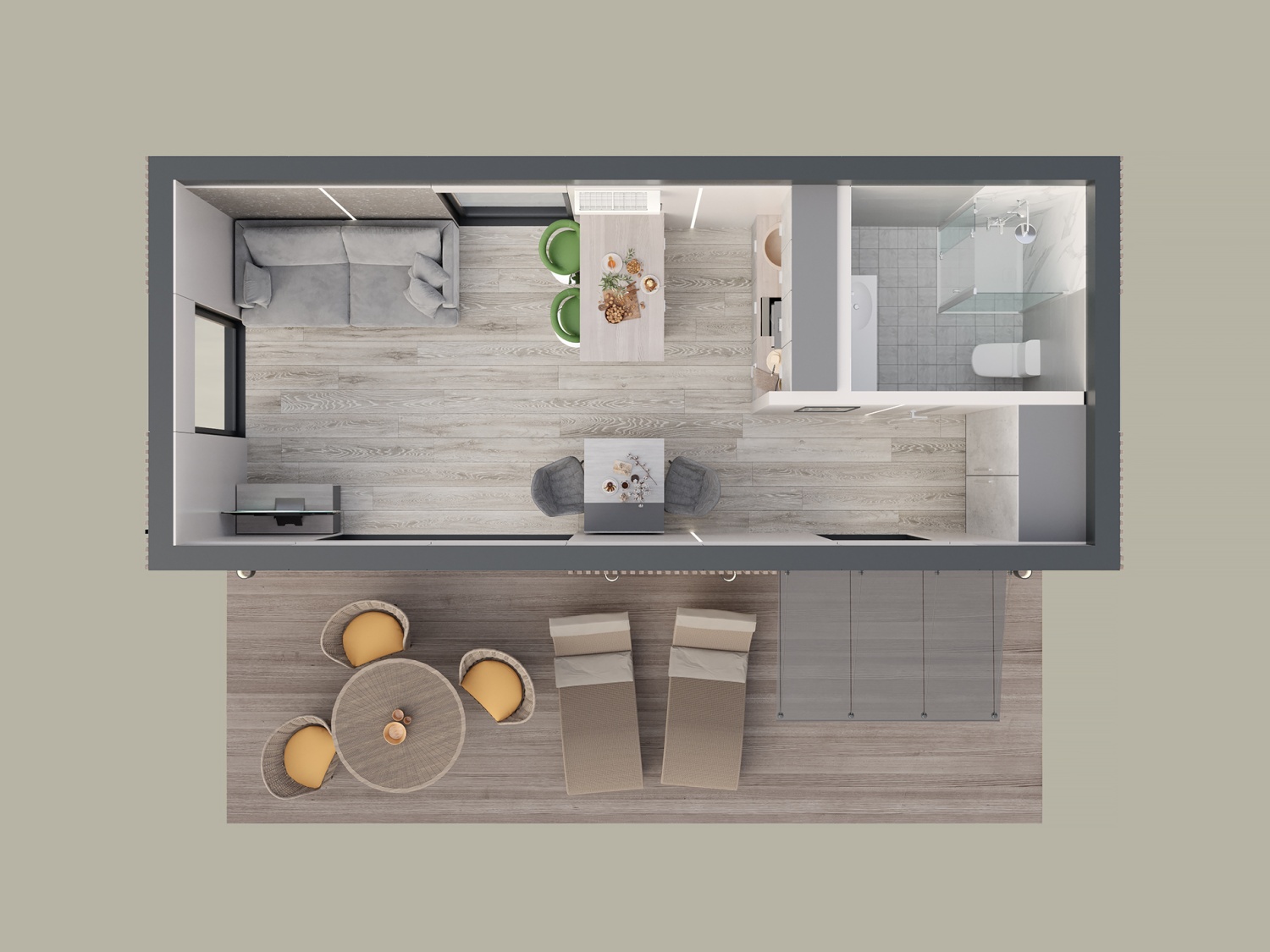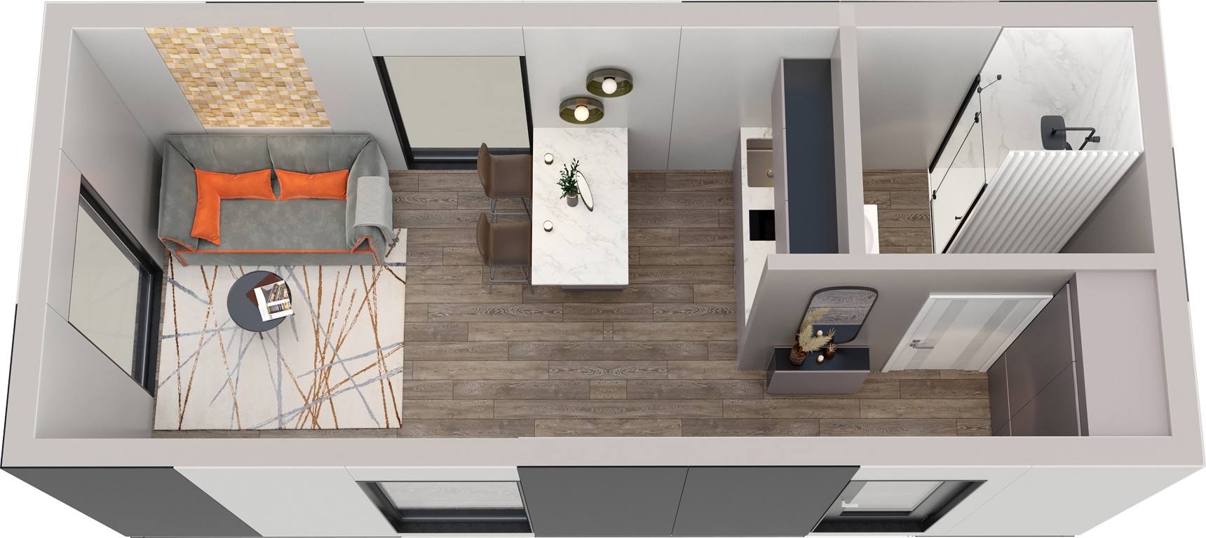 Модуль МИР занимает всего 30 квадратных метров, но в нем спланировано всё для Вашей комфортной жизни.