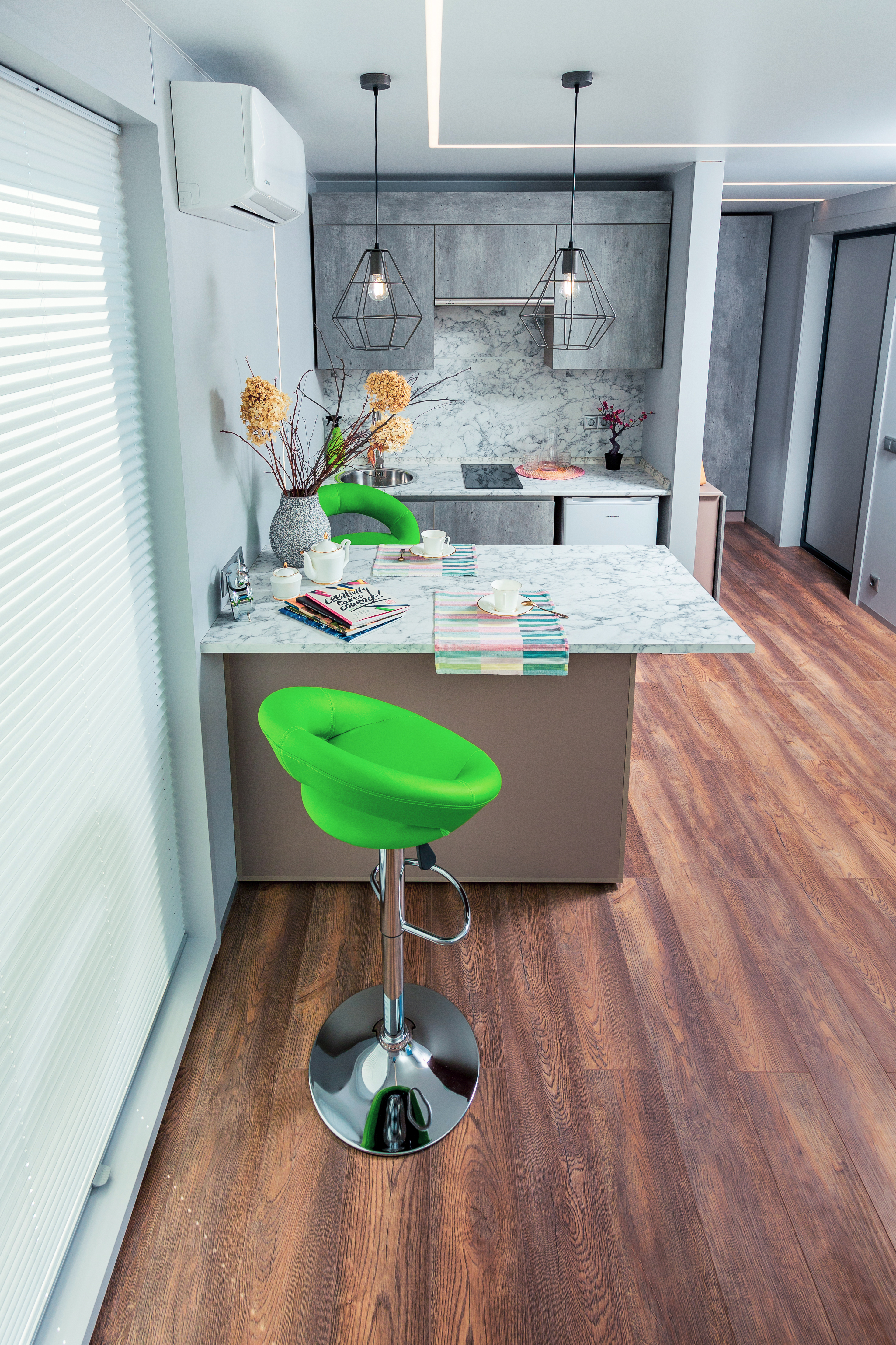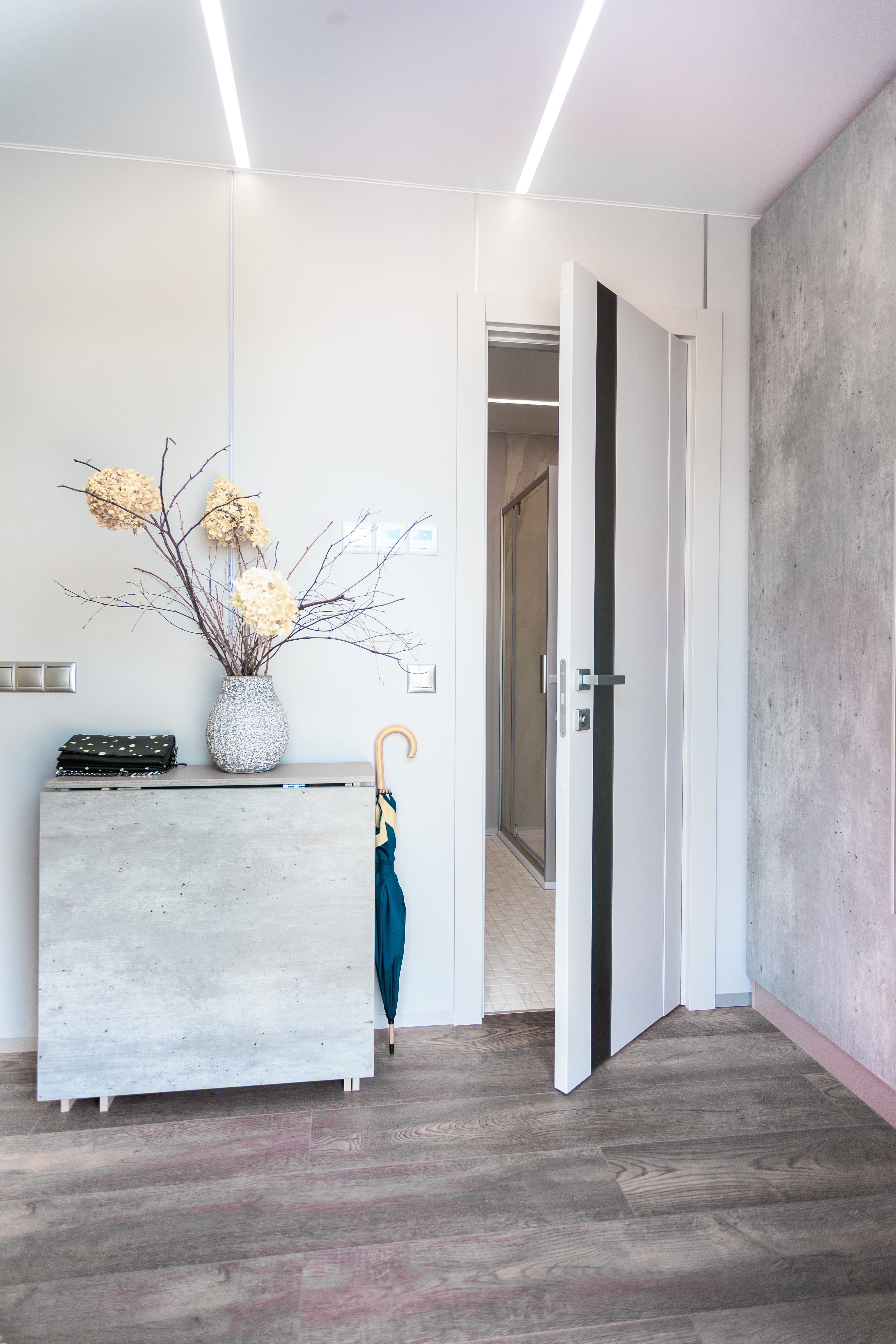 - стены - стекломагниевые листы 8 мм, окрашенные акриловой краской, деревянная реечная панель