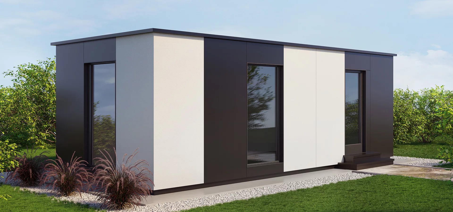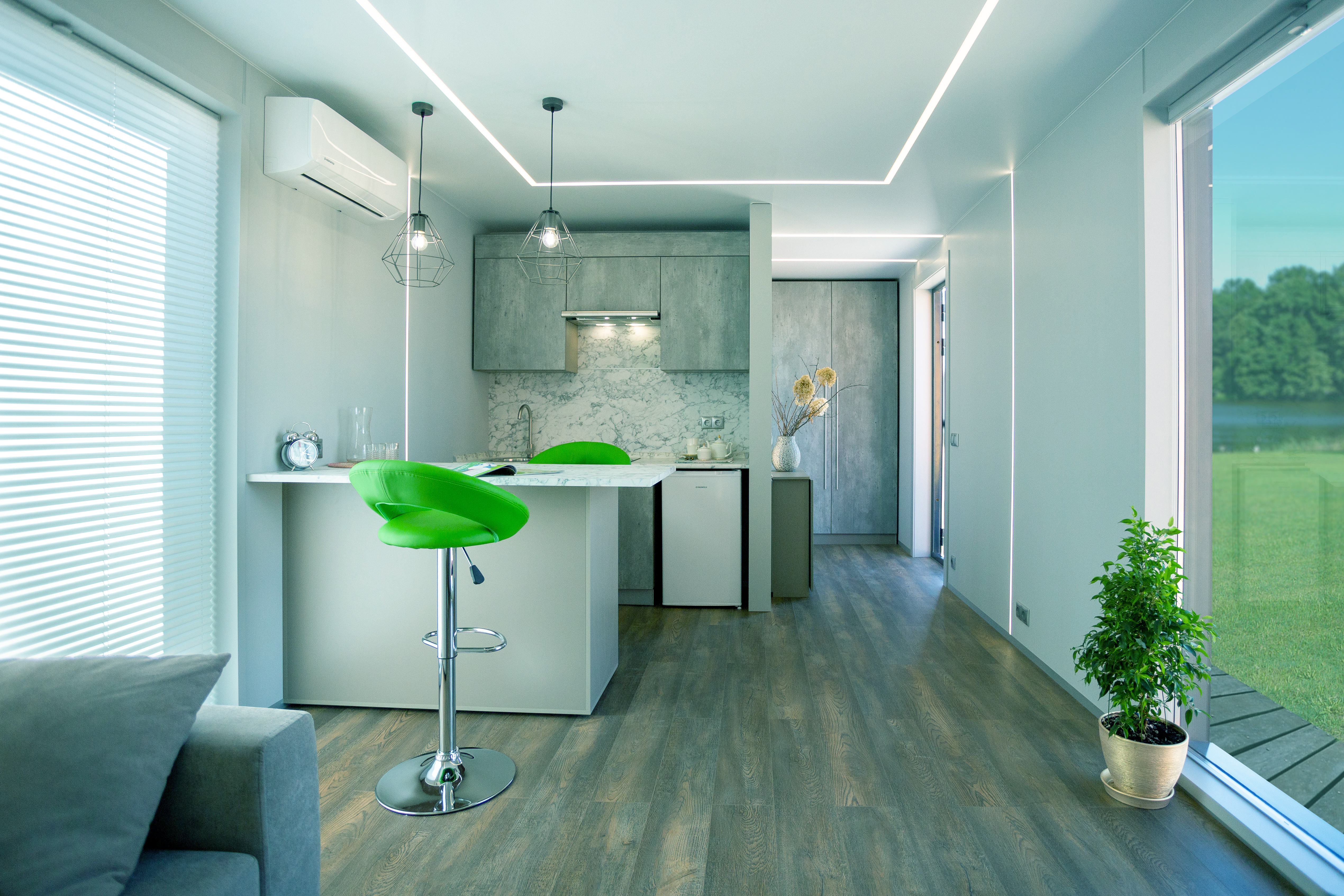В доме панорамные окна и продуманное освещение. Тёплые полы, кондиционер и бризер обеспечат возможность для комфортного круглогодичного проживания. При необходимости, можно расширить площадь дома, присоединив дополнительный модуль.